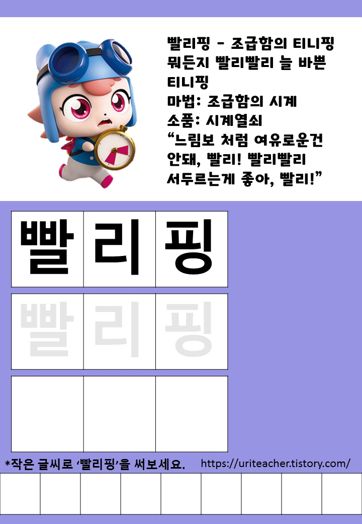 | 알쏭달쏭 캐치! 티니핑! 한글쓰기 [퐁당핑, 힘내핑] (0) | 2023.07.14 |